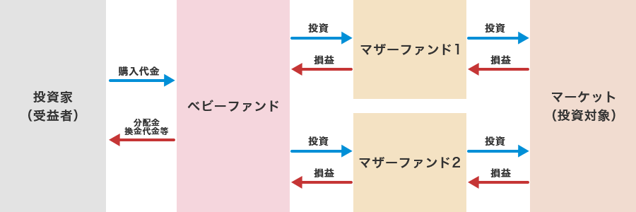 投資家から投資された資金をまとめた投資信託をベビーファンドとし、その資金の全部または一部をマザーファンドに投資して、マザーファンドにおいて実質的な運用を行う仕組みです。複数のファンドをまとめて運用することで、資金の流出入管理が容易となり、資金効率が改善します。また、規模の大きさを活かした売買コストの削減効果も期待されます。