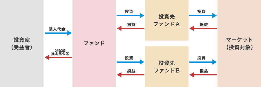 株式や債券などに直接投資するのではなく、複数の投資信託を投資対象としているファンドのことをいいます。ファンド・オブ・ファンズは、複数の投資信託を組み合わせて運用スタイルを分散させることを通じて、リスクの分散が期待されるなどが特徴の一つとされています。