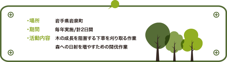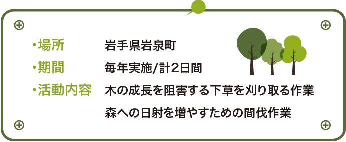 私たちは岩手県岩泉町にある「三菱UFJアセットマネジメントの森(通称:MUAMの森)」で、定期的なメンテナンス活動を実施しています。