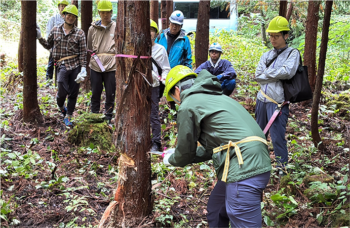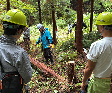 ノコギリやナタを使って、痩せた木や曲がった木を伐採し、健康な木の根元まで日光が届くようにします。木を倒す際には、3人がかりで押すなど、複数人での協力作業が必要です。