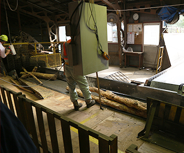 三菱製紙 北上工場では木材を細かく砕き、「チップ」と呼ばれる小さな固まりに加工しています。その後、木材チップを北上工場(岩手県)や八戸工場(青森県)に運び、パルプからFSC森林認証紙に加工しています。